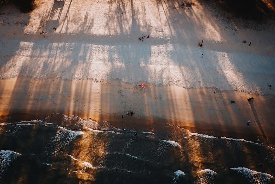 A golden hour PDF often includes diagrams and charts to illustrate the sun’s position and light scattering principles, helping photographers understand and predict this magical time. These resources highlight how the sun’s low angle and atmospheric interactions create the perfect conditions for capturing stunning images with warm, golden light.
